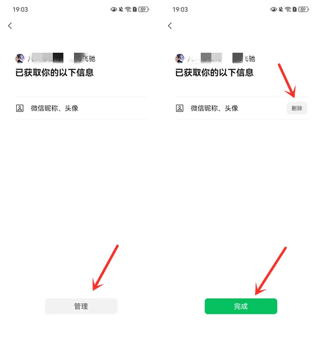 3、若想删除授权,就点击底部的【管理】按钮,然后点击【删除】按钮,并点击“通知开发者删除”,最后点击【完成】按钮,接下来就是等小程序开发者删除自己微信的授权信息即可。