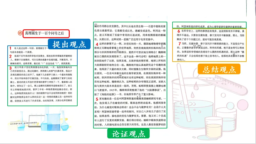 2.中间通过具体事例证明观点(波义耳发现植物酸碱反应并发明石蕊试纸;魏格纳观察地图提出”大陆漂移说“;阿瑟林斯基发现脑电波的变化与做梦有关)
