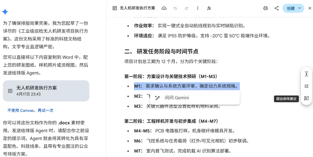 ▸ Gemini会在Canvas空间生成初始框架,你可以直接编辑文字、添加段落、让AI继续扩展某个模块。