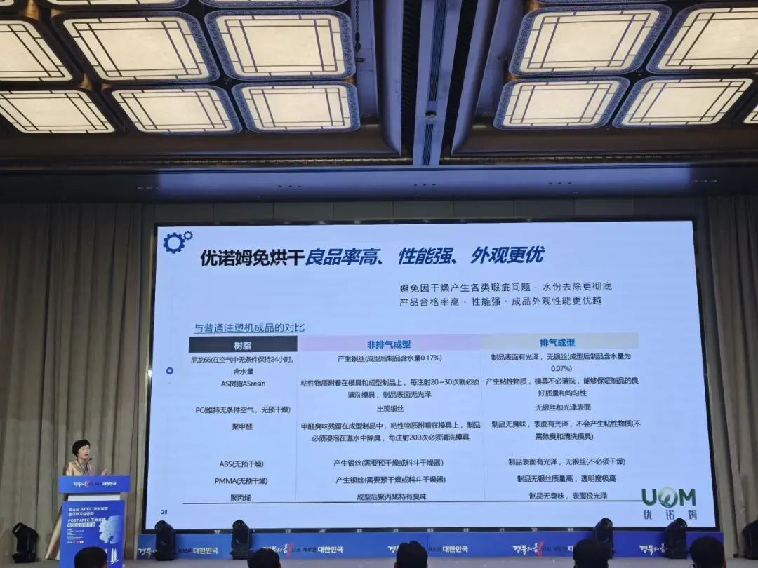 台上,优诺姆董事长用简洁有力的语言,向韩国庆尚北道政府及企业代表介绍了优诺姆免烘干排气式注塑机的核心技术——在塑化过程中主动排气,将原料中的水分、挥发物、杂质一并排出。