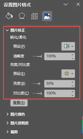 设置图片格式中选择:图片校正,把清晰度调整为100%,亮度调整为50%,对比度调整为100%。