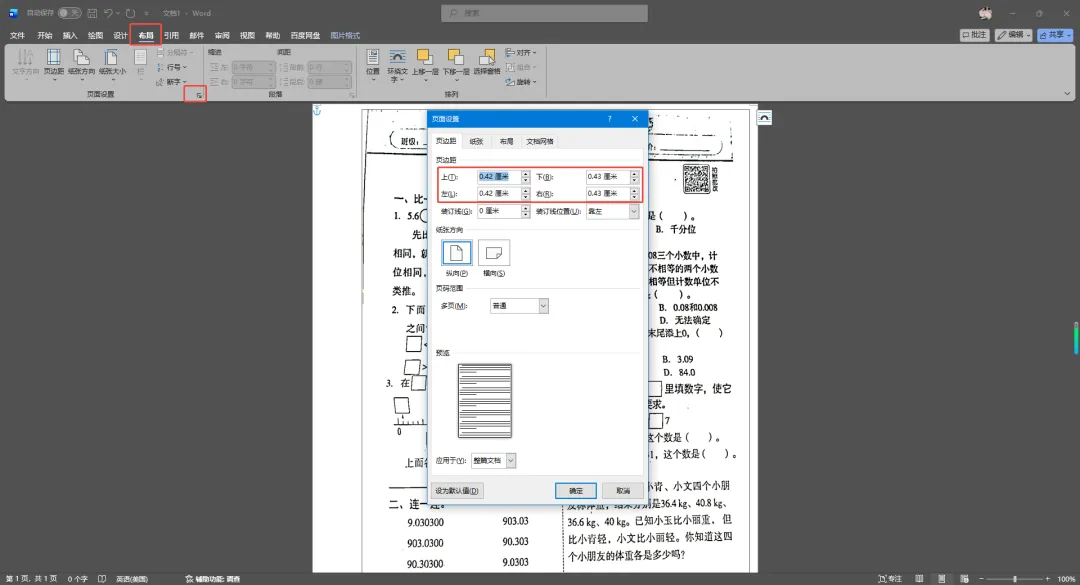 点击布局选项卡, 点击页面设置栏右下角箭头图标 ,打开页面设置对话框。将页边距中上、下、左、右设置为0。