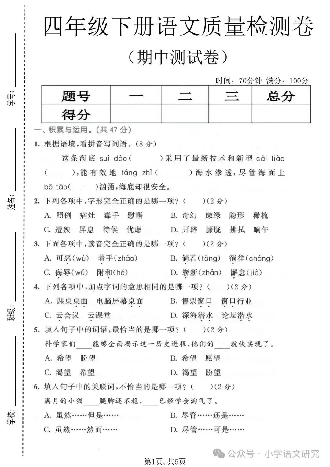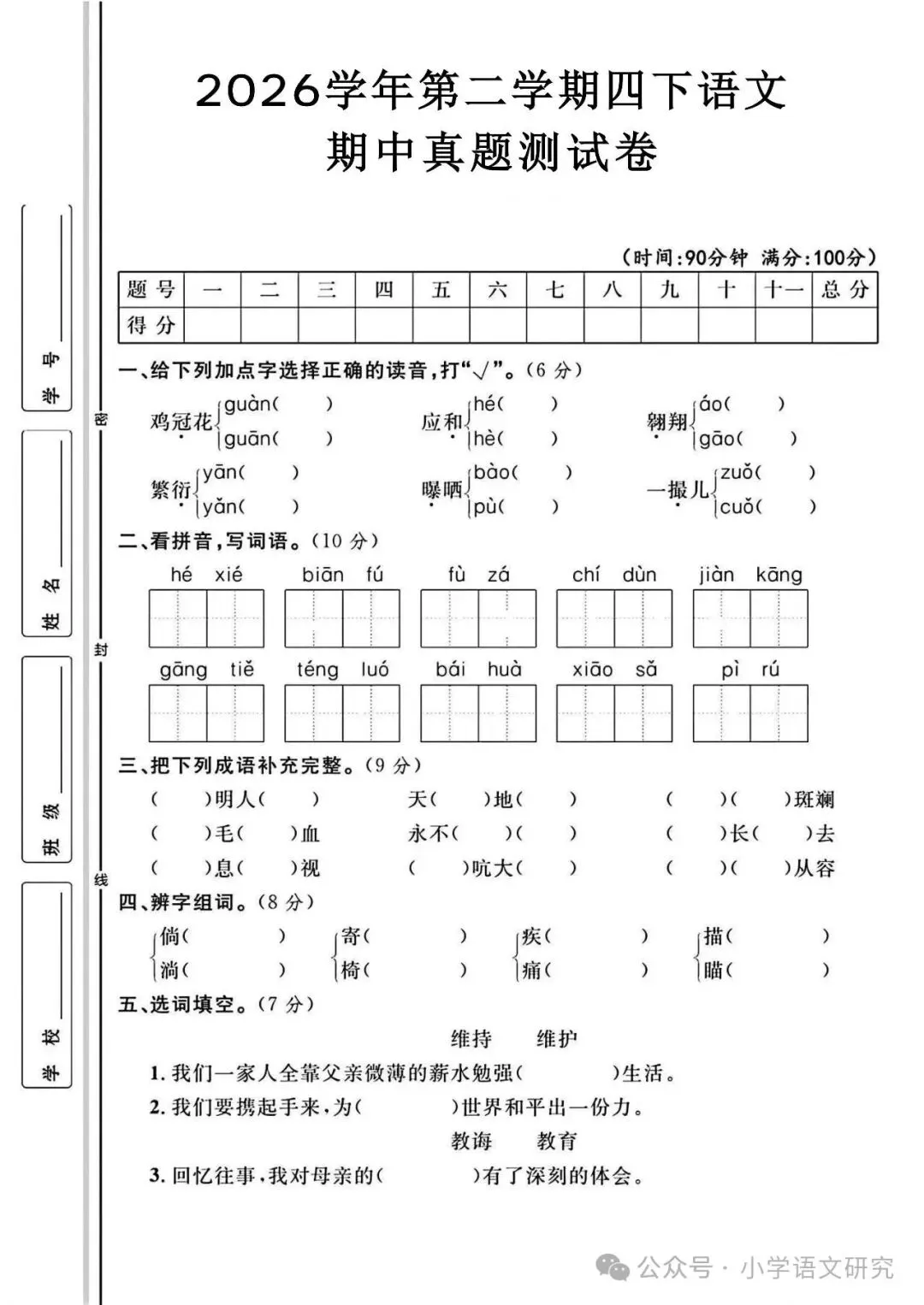 26春四年级语文下册《期中测试卷》4套丨可打印