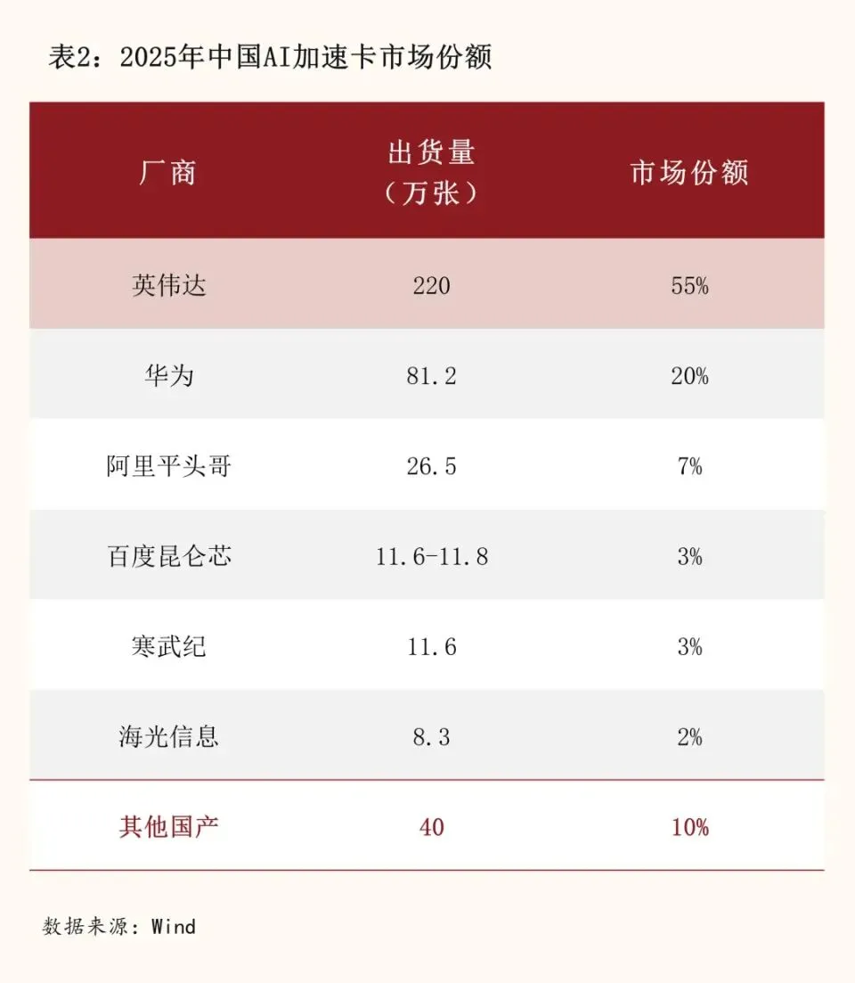 黄仁勋为啥越来越急,一张图表足以说明!Wind统计显示…….. 黄仁勋为啥越来越急,一张图表足以说明! Wind统计显示,2025年,华为卖了超81万张AI加速卡,阿里的平头哥也卖了26.5万张,就连很多网友认为“路边一条”的百度(旗下昆仑芯)都卖了近12万张,然后寒武纪和海光加一块也有小20万张。 2026年,这些厂商持续发力,而且我们的制造能力也同步升级,意味着,它们的出货量将水涨船高,把英伟达“挤掉”,也只是时间早晚,快的话,三五年,慢的话,也就六七年。 届时,英伟达将成为中国智能机市场的“三星”,勿谓言之不预哦