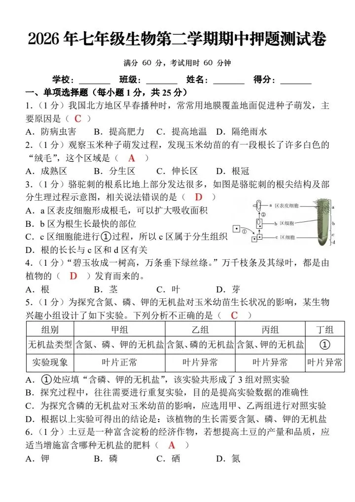 今日分享26春七年级下册生物期中模拟卷2套(完整电子版可打印)!高清可打印,每日轻量练习,拒绝无效刷题,用系统化资料筑牢学科基础,让假期成为提升的黄金期,开学轻松领跑。