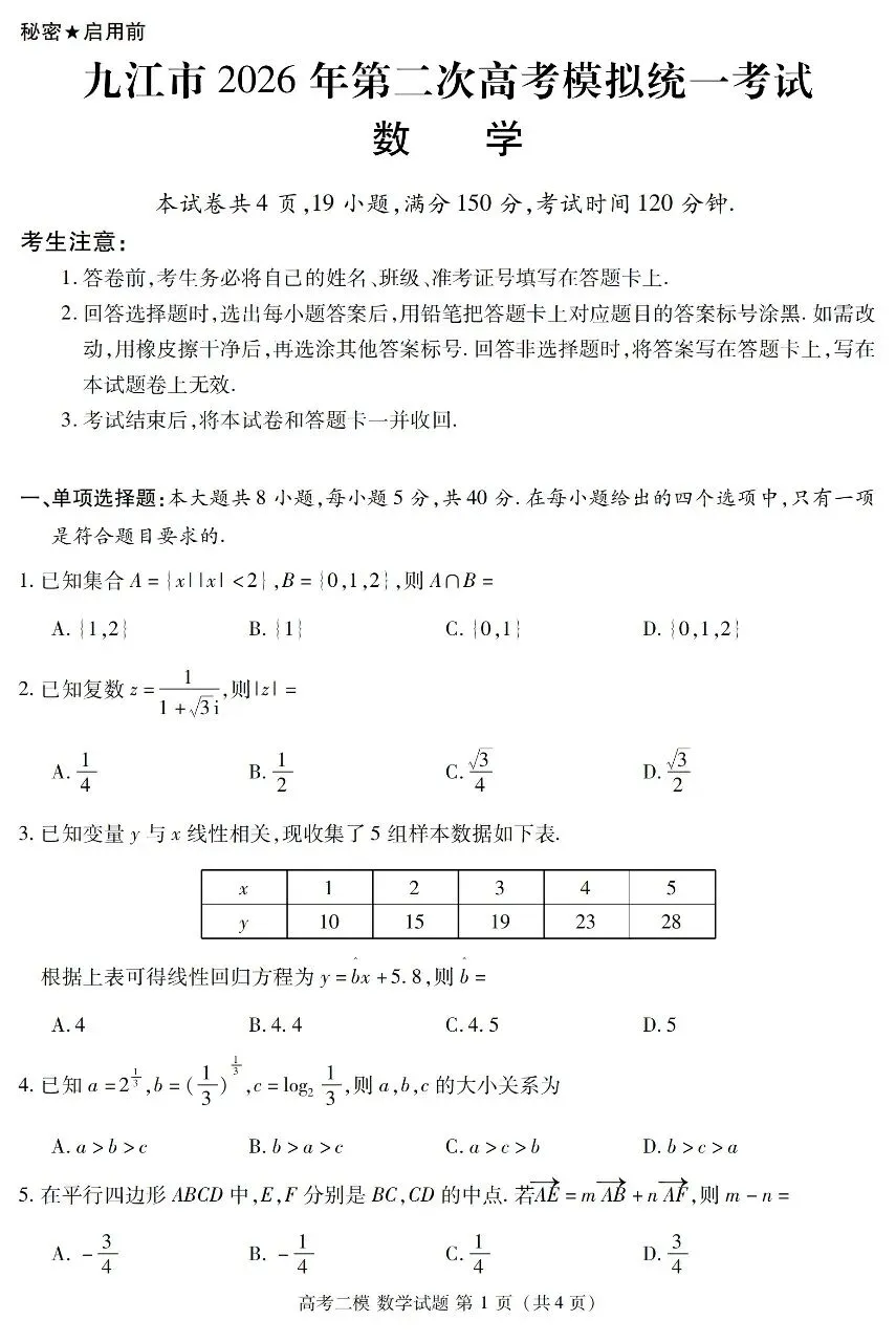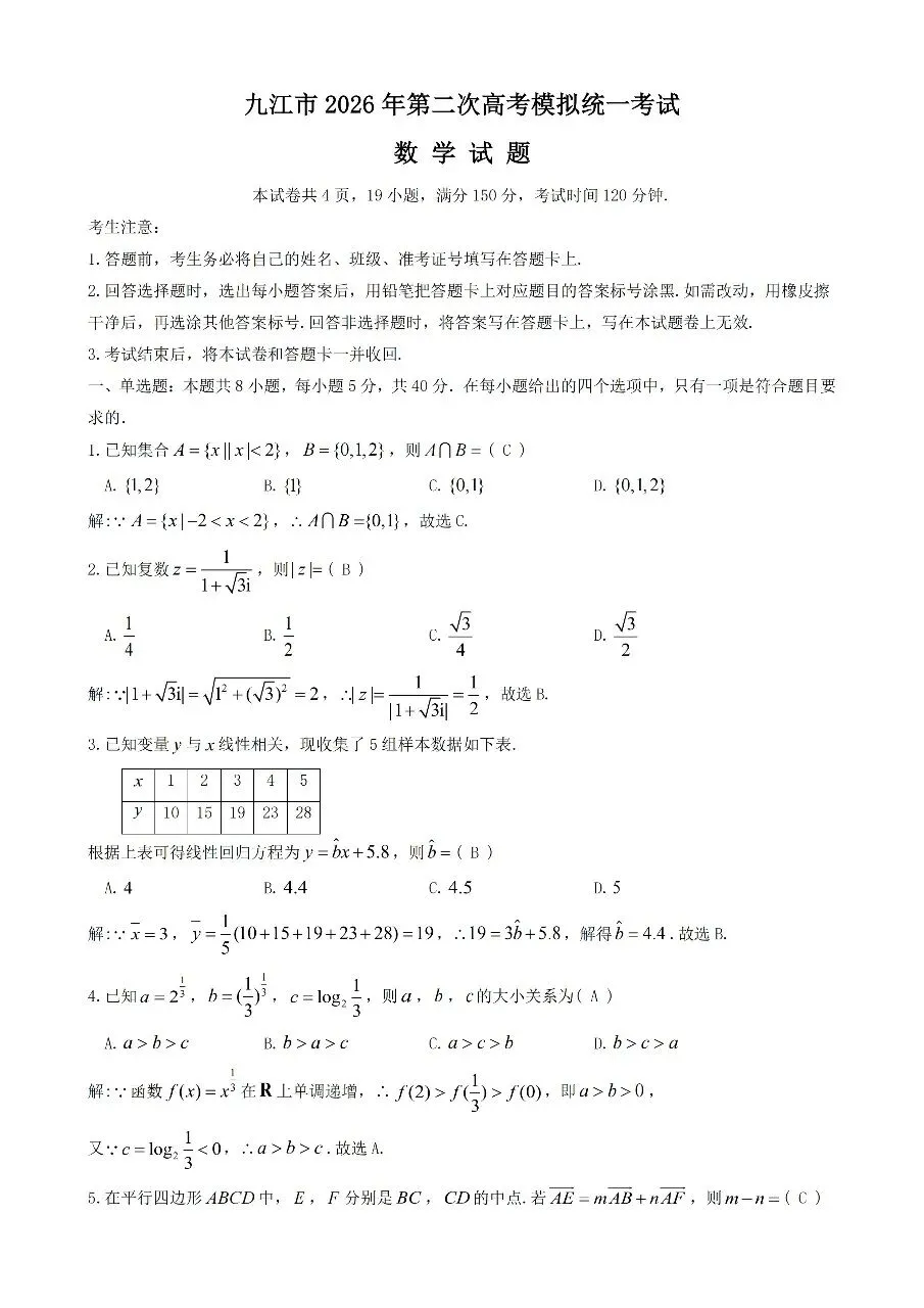 【免费下载】江西省九江市2026年第二次高考模拟统一考试数学试题及答案202604 点击上方“数海耕耘”关注 文末免费下载整篇文档电子版 点这里下载试题电子版 点这里下载答案电子版 不是高考卷胜似高考卷 免费下载以下10套经典模拟题 【必刷卷】不是高考卷胜似高考卷强烈推荐2026年含金量极高的十套高考模拟卷(附详细答案)可下载打印 (里面包含武汉三调,浙江Z20,长郡中学联考,成都七中二模,温州一模,江南十校,佛山一模,东北三省,扬州一模,赣州一模共10套经典模拟卷) 更多精彩内容,请关注公众号… 喜欢本文就点个赞吧!
