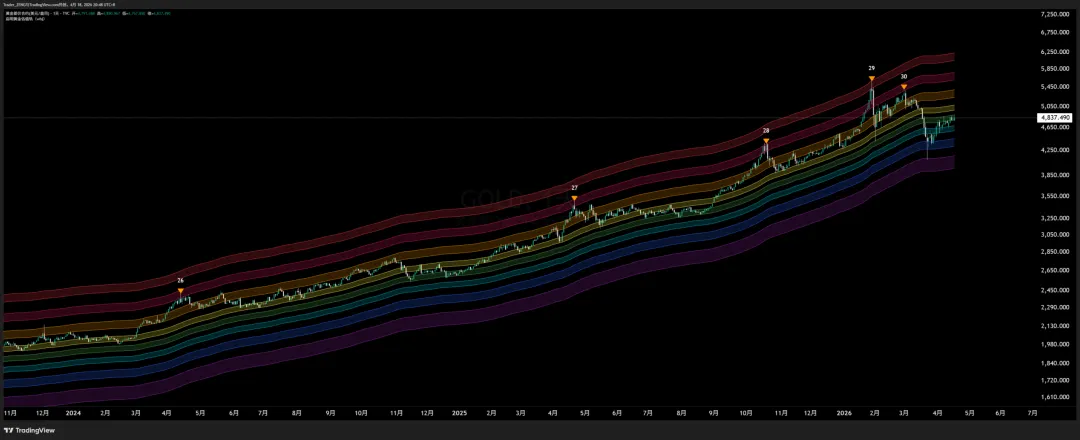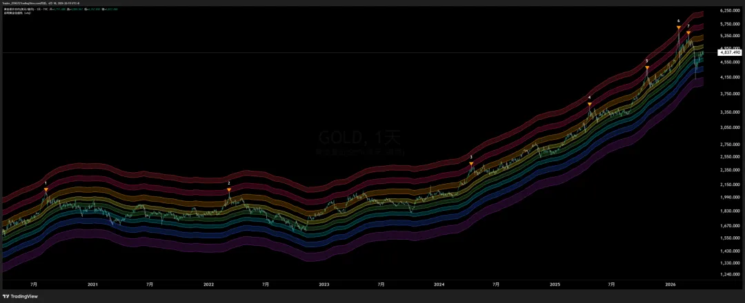 在这轮上涨中,金价到目前为止仅2026年有 1 次触及最上方大红色上轨。