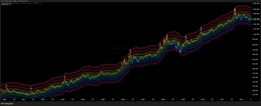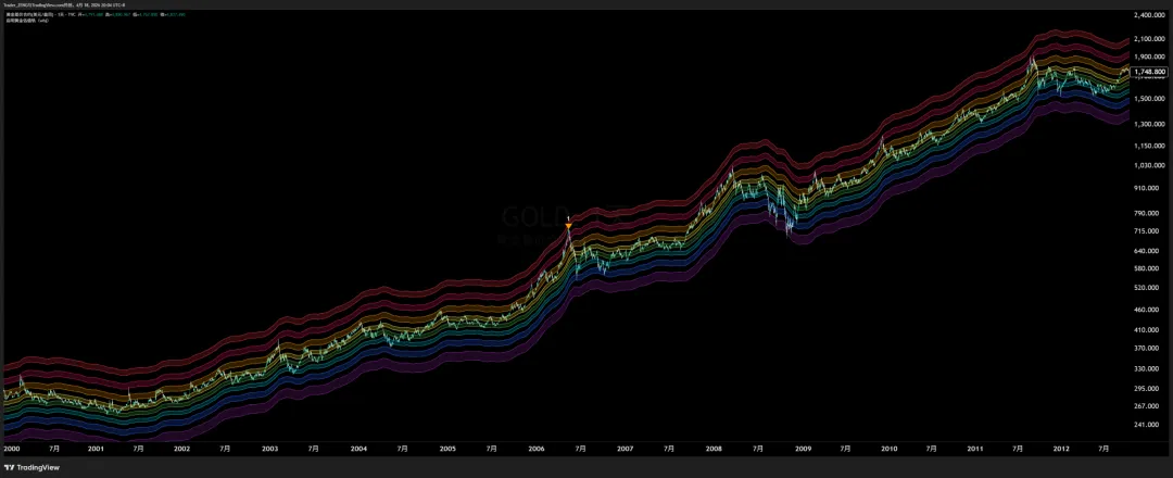 这与 2000—2011 年周期中的表现具有一定相似性:当价格真正打到最上方极端红轨时,市场通常已处在明显过热区域,后续更容易出现较深级别的修正。