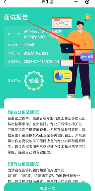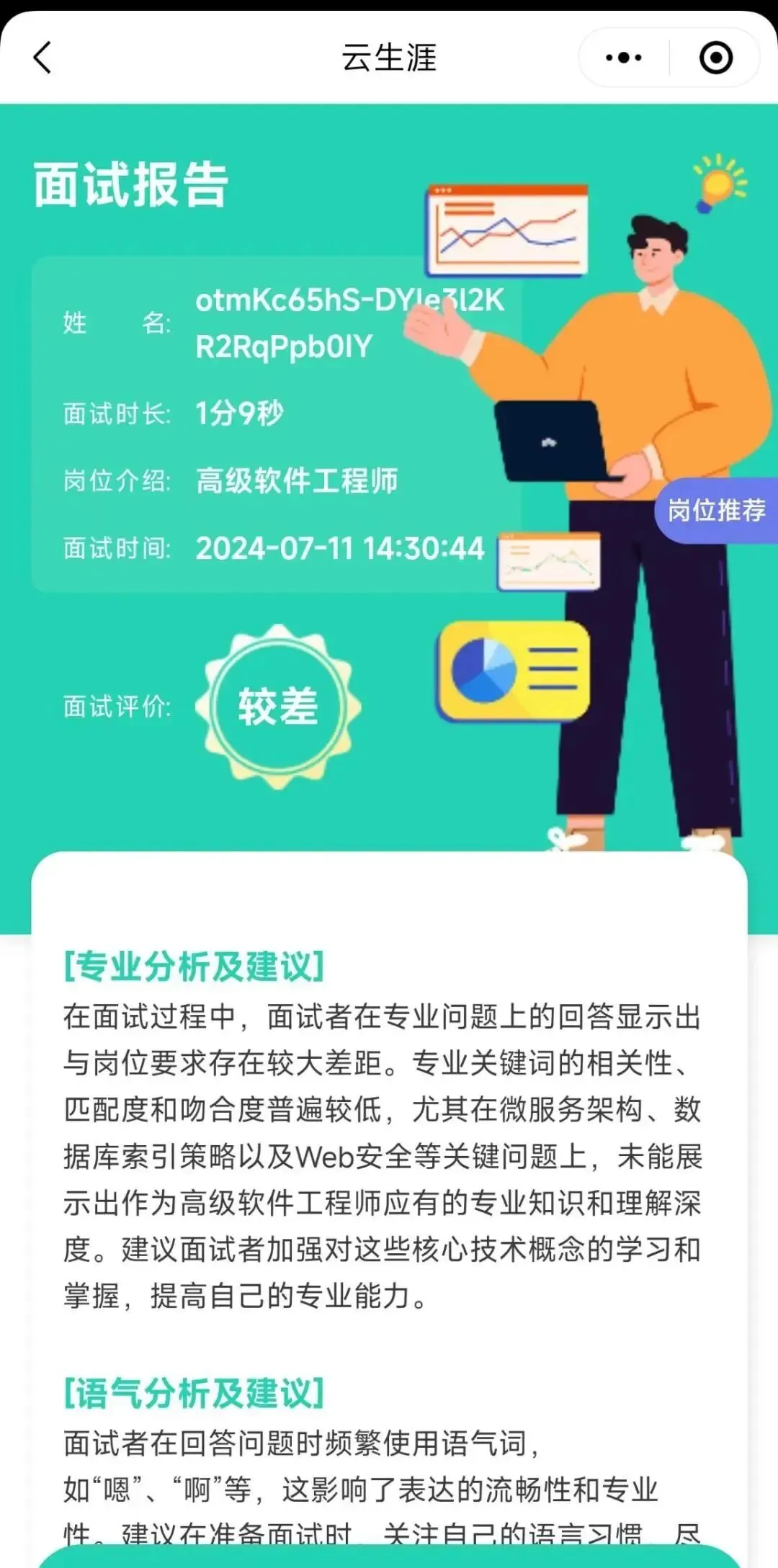 面试结束后,AI会为你生成一份详细的面试报告。这里面不仅有你的表现分析,还有专业建议,让你知道自己哪里做得好,哪里可以做得更好。