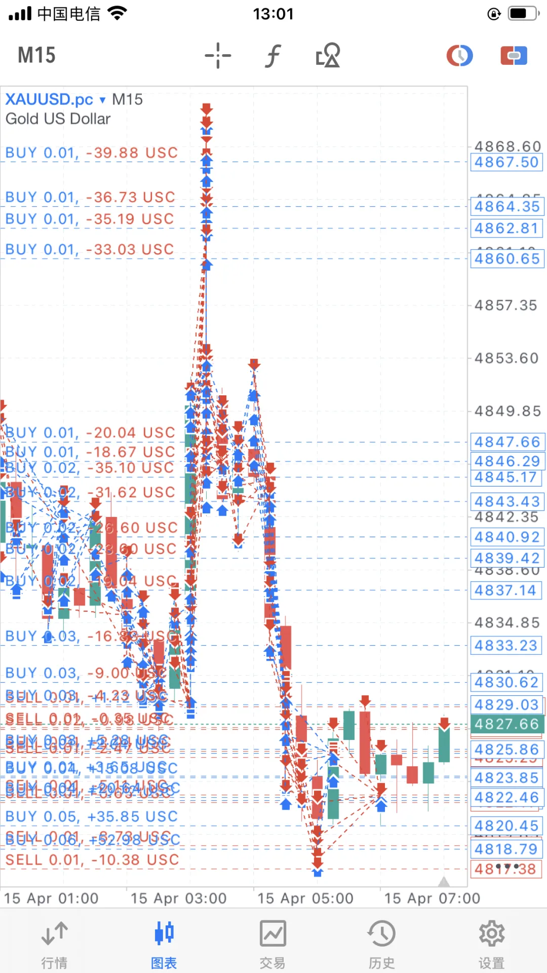 间隔自适应:当行情急速的时候,它会自动调大间隔距离,避免过于密集加仓,下图是实盘加仓案例: