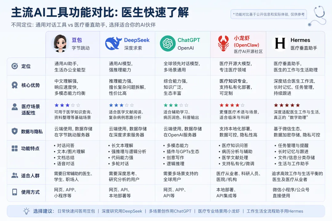 在临床工作和生活的间隙,你一定听过这些名字:豆包、DeepSeek、Chatgpt,还有前段时间被反复提到的“小龙虾(OpenClaw)”,以及近期火热的爱马仕(Hermes)。