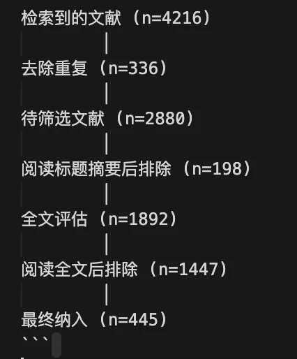 以某个主题为例,他的过程正的工作文献数据流如下,可以看出涉猎数量还是非常庞大的。