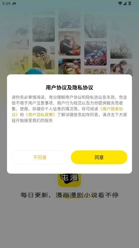 1、在手机上运行屯屯漫画app,同意协议并进入;