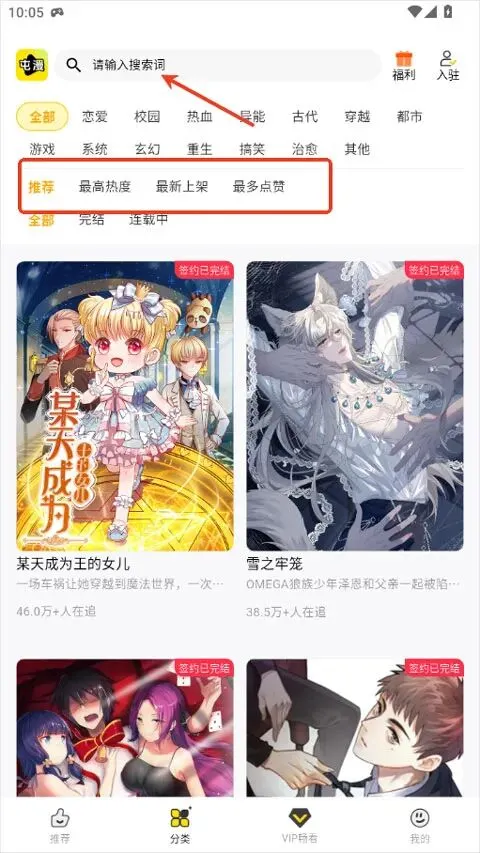 6、如果不知道想看什么漫画,还可以在分类中,输入关键词或者看榜单选择。