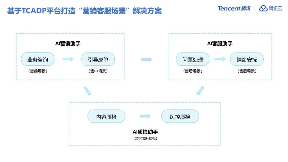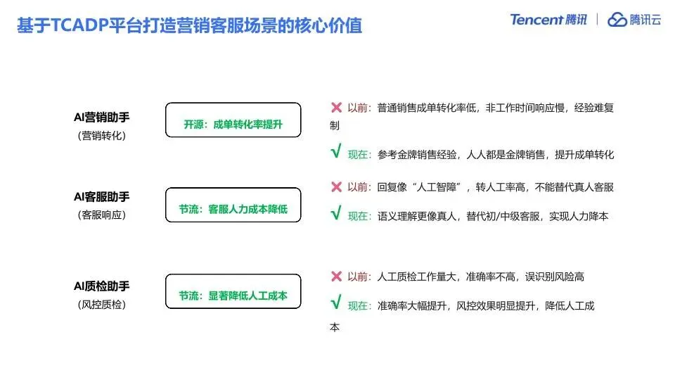 腾讯云智能高级产品架构师赵旭东,首先分享了基于腾讯云智能体开发平台(TCADP) 打造的“营销客服场景”解决方案。该方案的核心价值可概括为三个关键词:开源、节流、风控。
