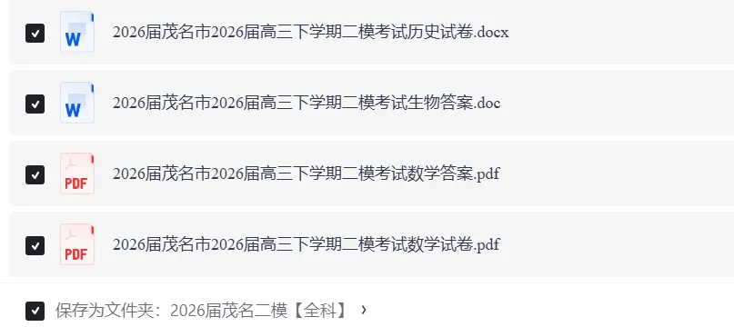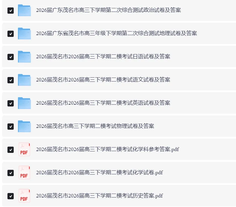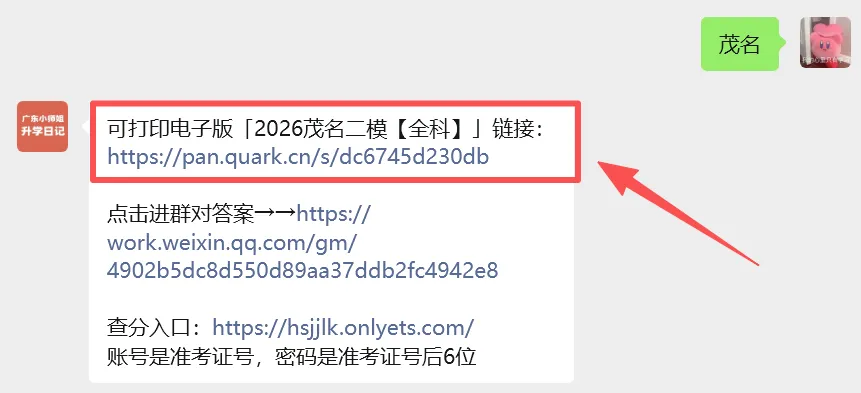 全科可打印!2026茂名二模试题+答案电子版下载! 广东省茂名市2025-2026学年高三下学期第二次综合测试 全科模考试卷+答案完整版, 请在【广东小师姐升学日记】公众号 后台私信“茂名” 即可下载完整版文档~ 部分内容预览👇 因文章展示篇幅有限 全科模考试卷+答案完整版, 请在【广东小师姐升学日记】公众号 后台私信“茂名” 即可获得完整版文档~ 广东高考大数据 各校分数线、院校介绍、 专业选科要求 扫码即可进入 ↓↓