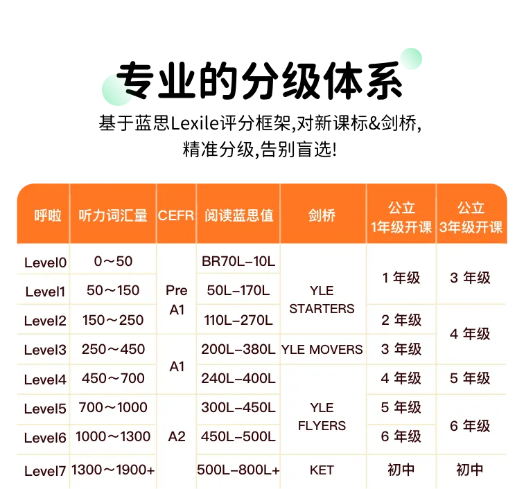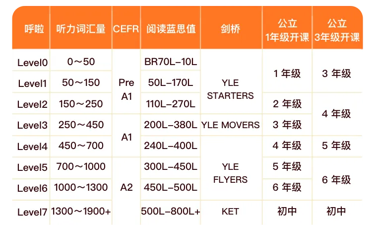 【课程级别】L0~L7共8个等级,覆盖年龄段4~12岁,详细分级如下图: