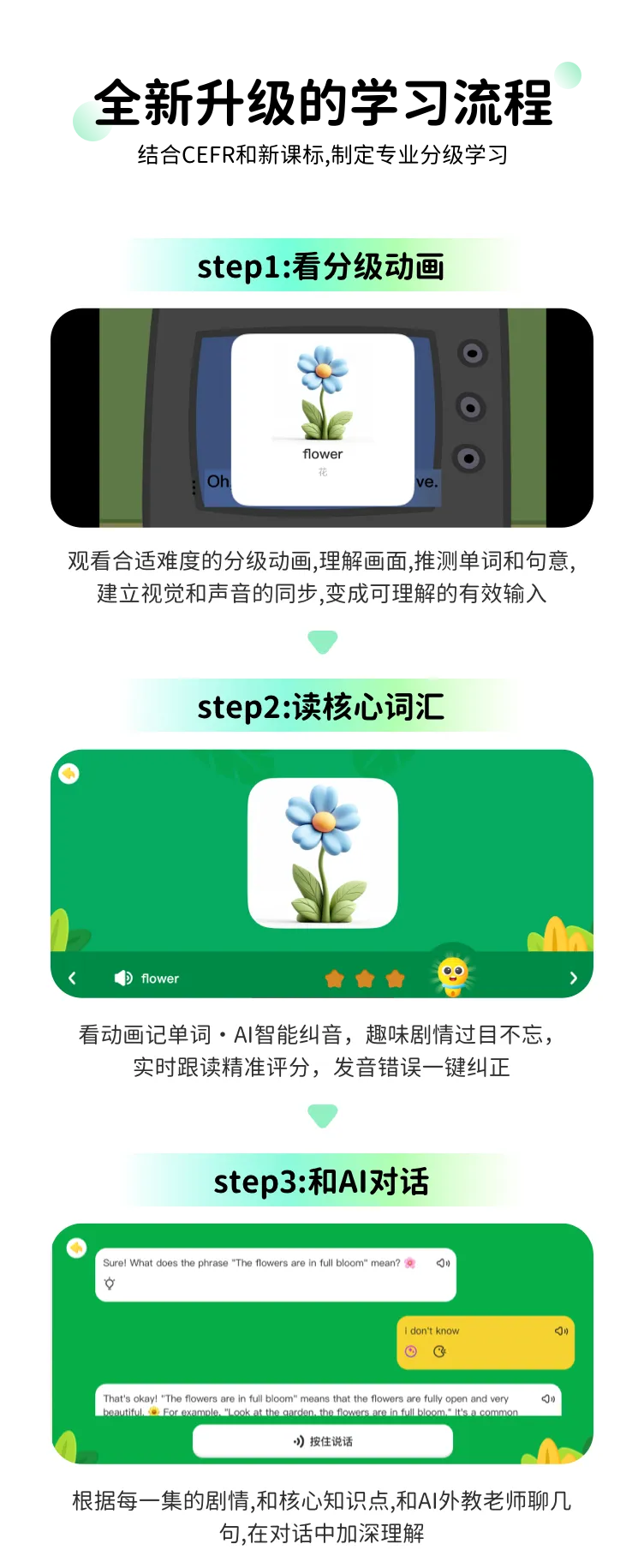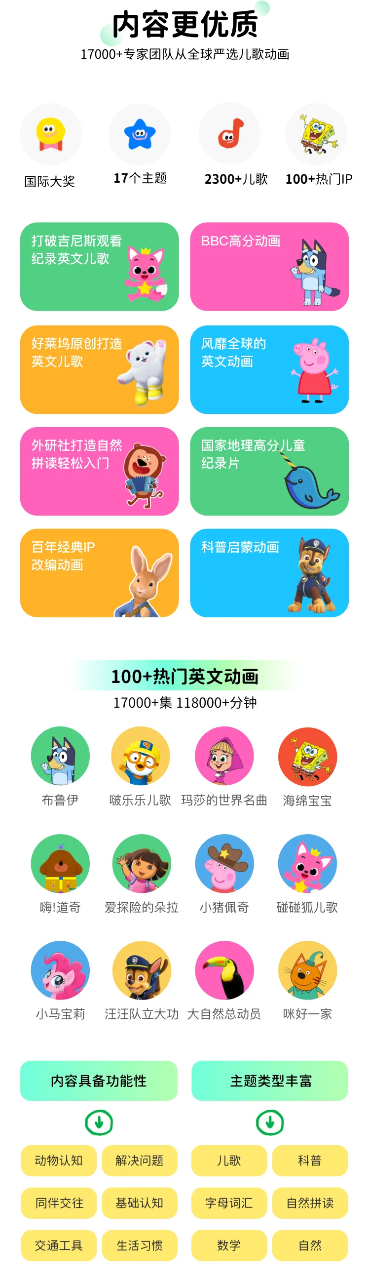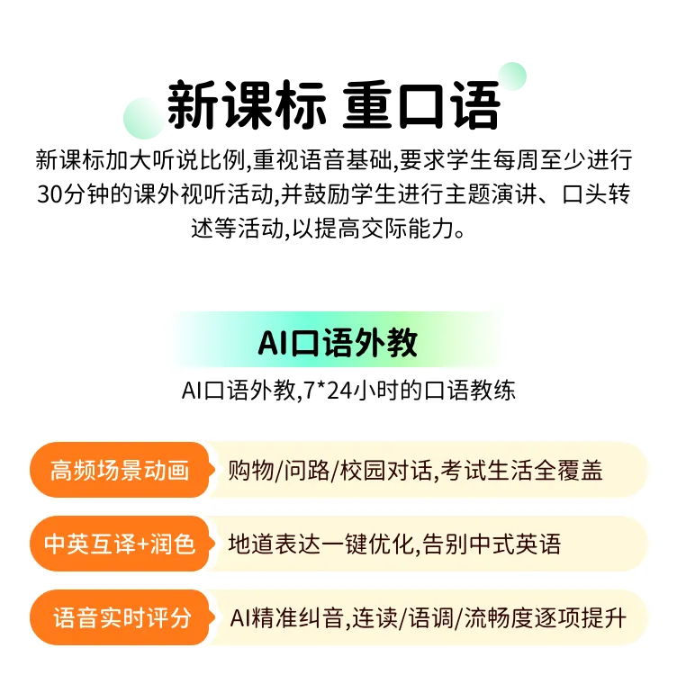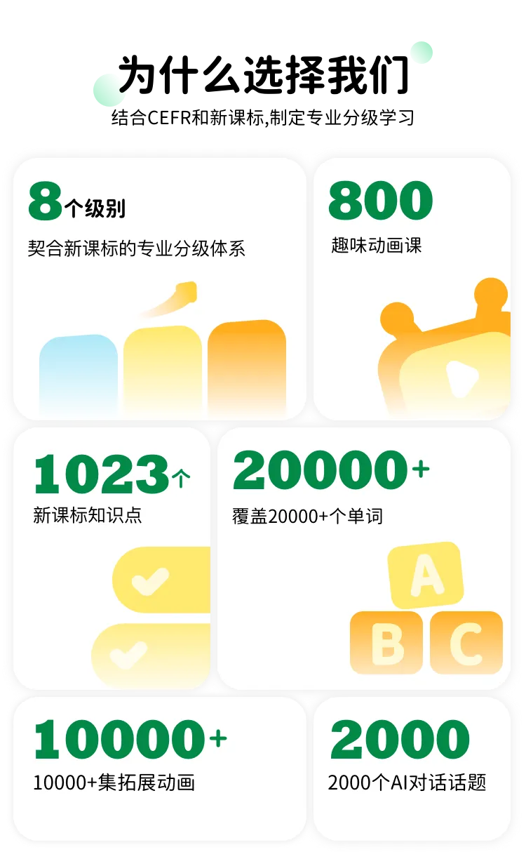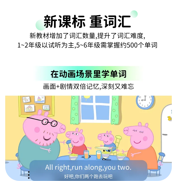【产品包含】800节动画课+10000集拓展动画,包含2000+个新课标知识点,配置AI口语、AI陪看、精学模式、查词等学习功能。
