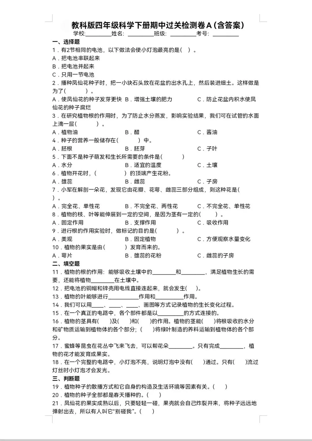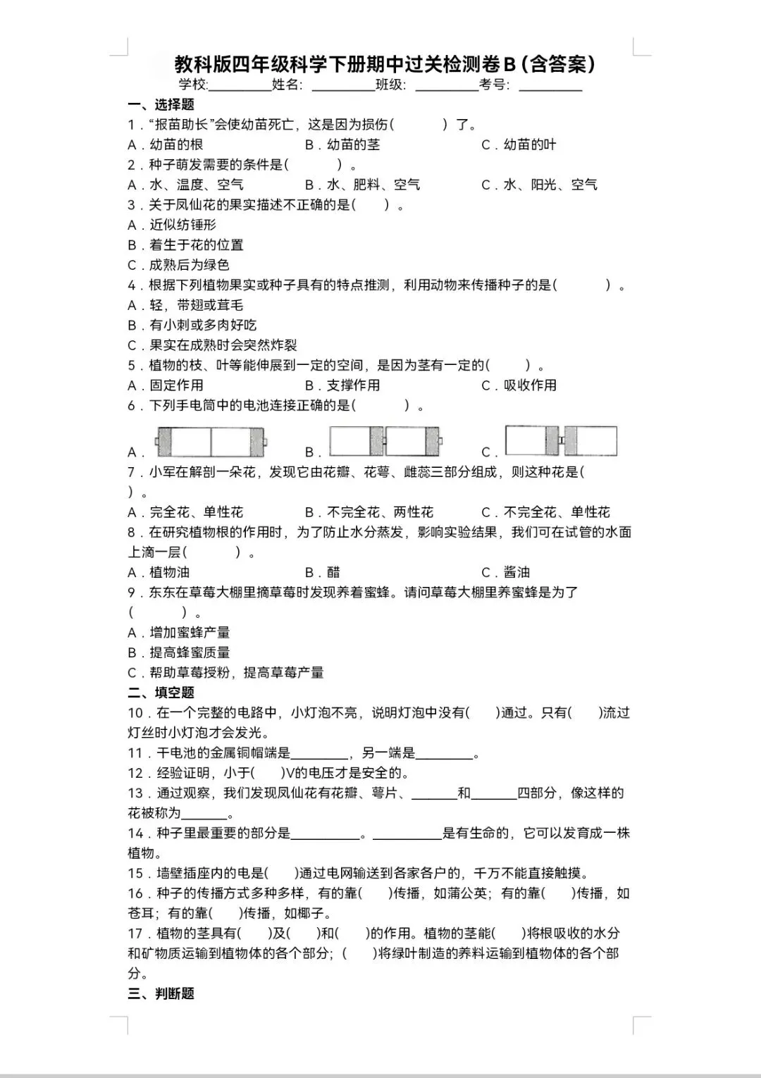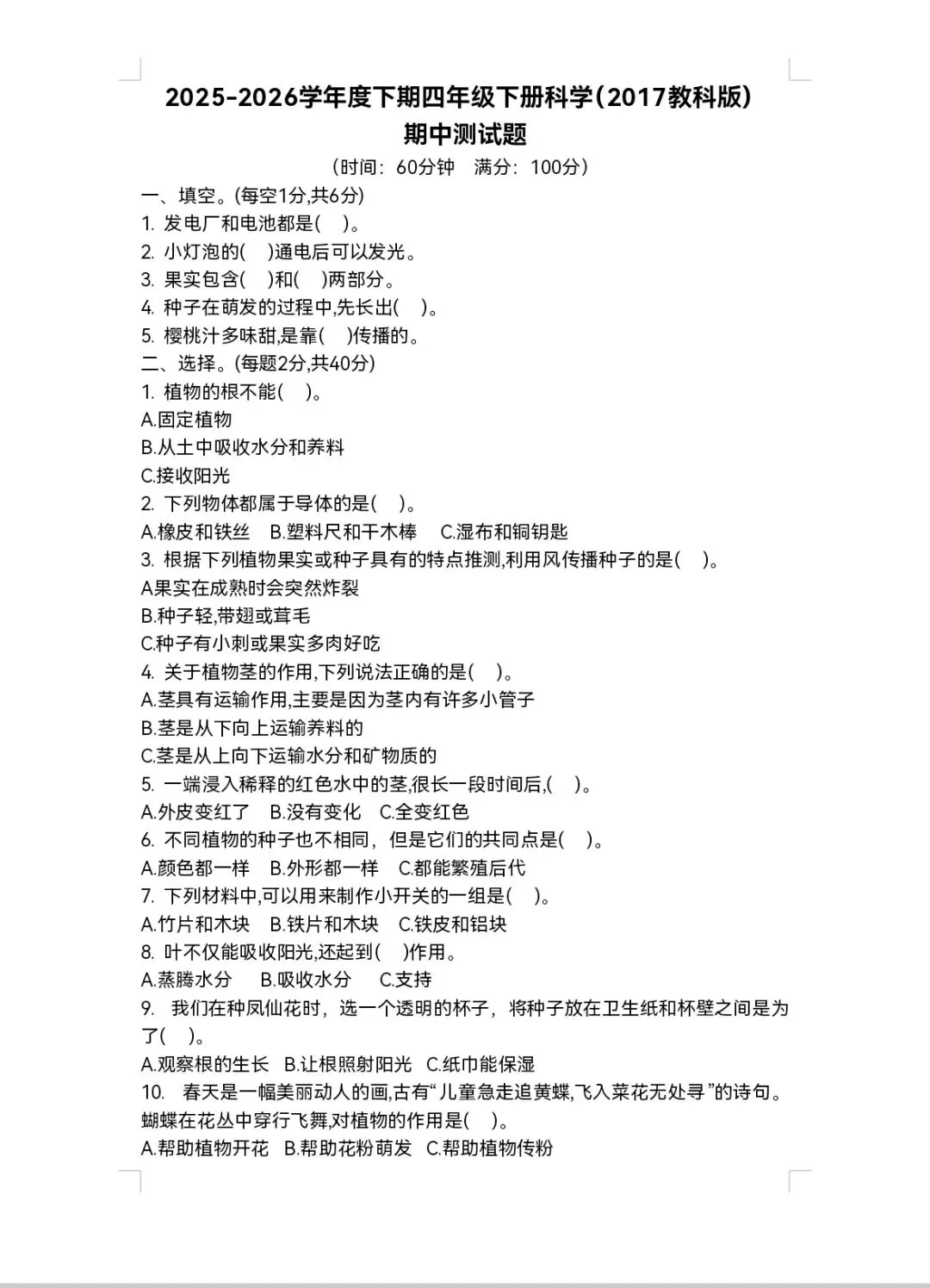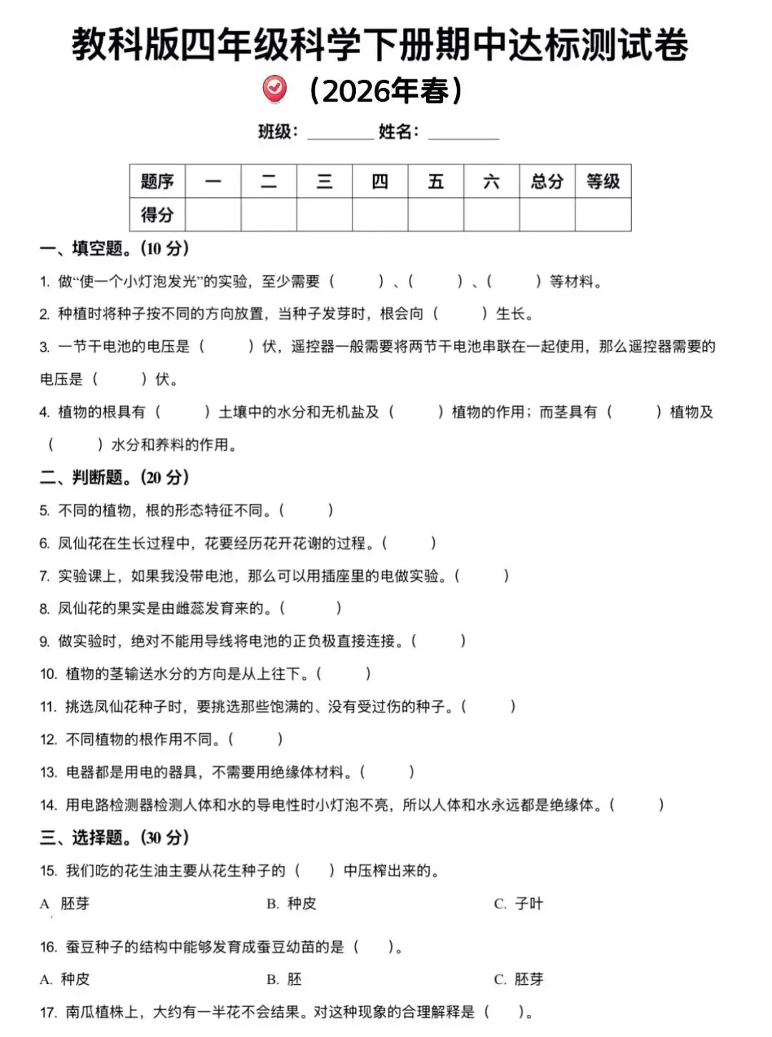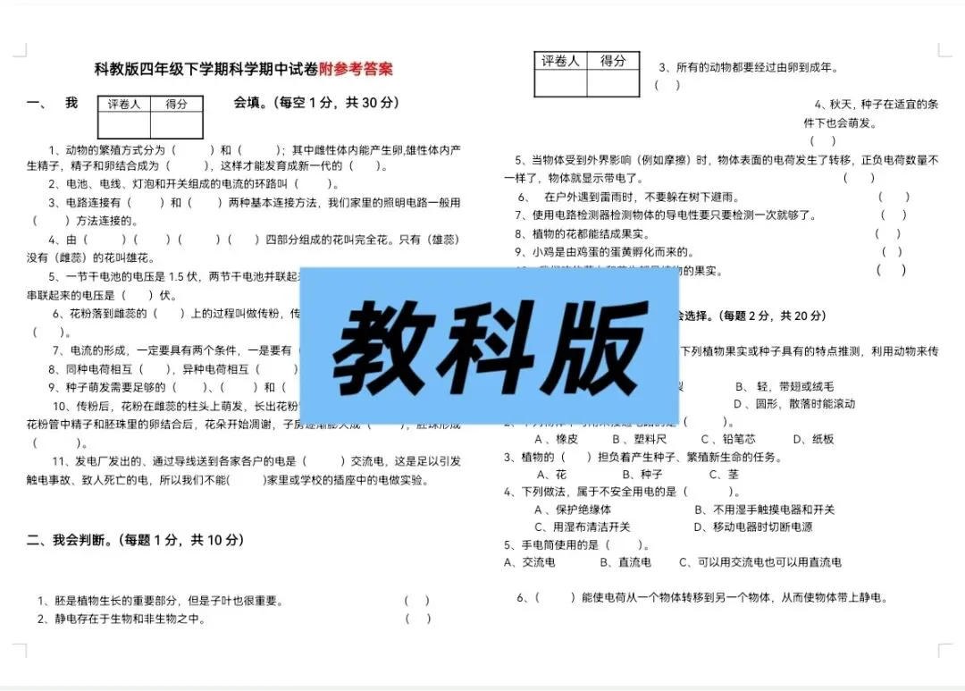 🌸 2026年教科版四年级下册科学《期中测试卷》(共5套,附答案)| 完整电子版可打印,通过真题及押题试卷测试,全方面复习四下科学基础知识及重难知识点,帮助孩子巩固科学知识,查漏补缺,提升解题能力和思维逻辑能力,熟悉考试题型和难度,增强考试自信心,期中考试取得好成绩!