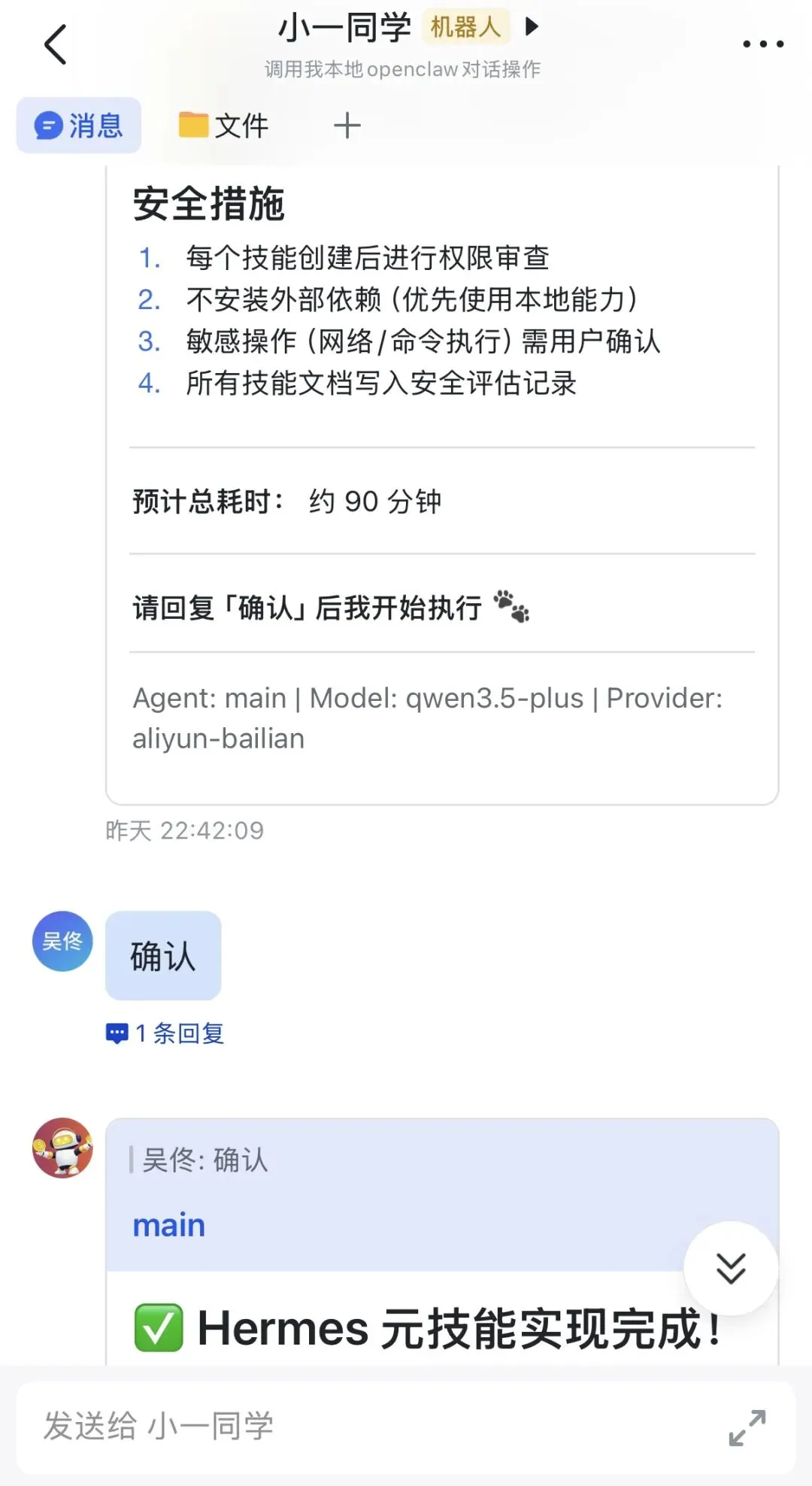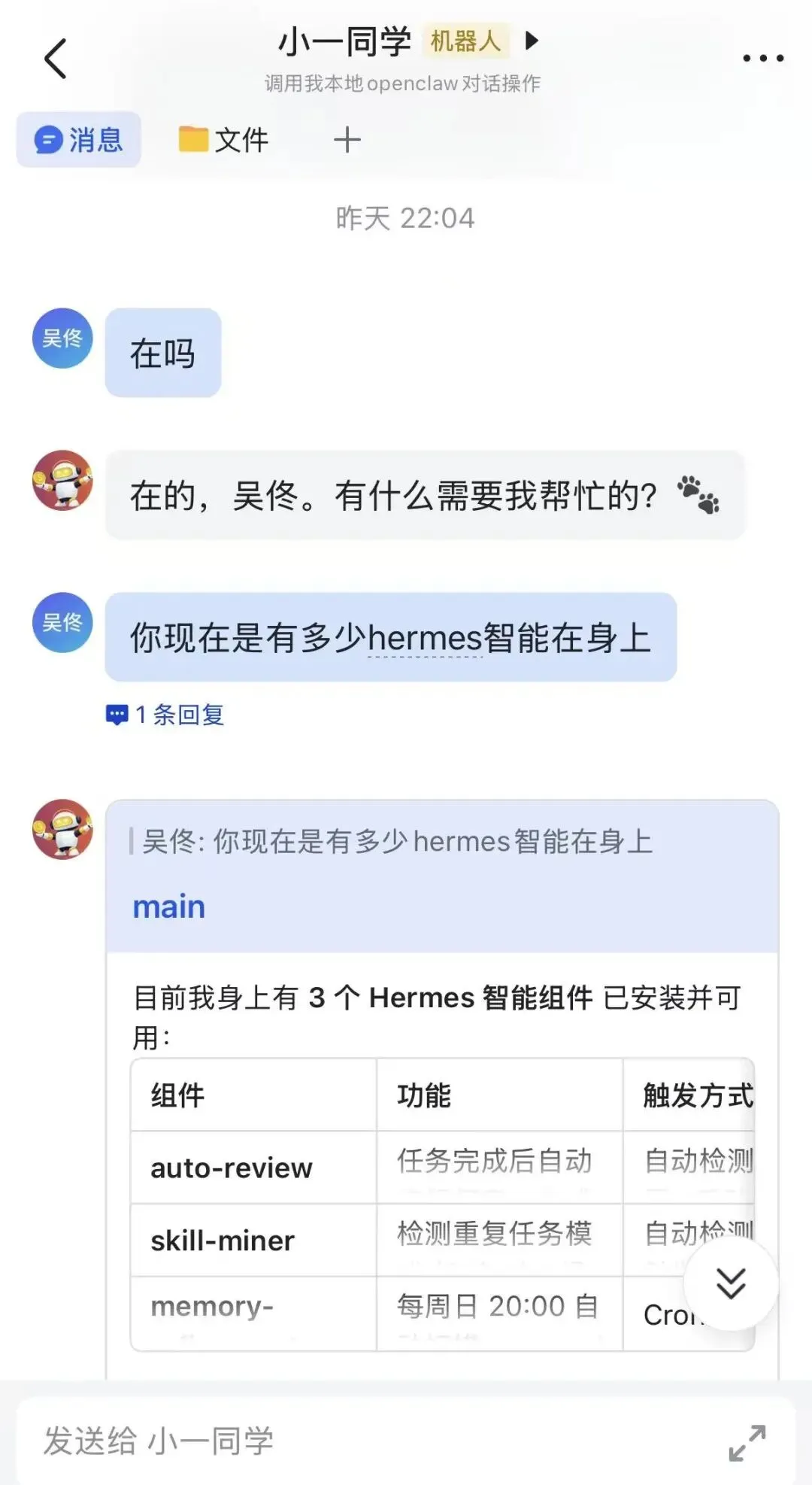 助理:小一同学( OpenClaw 手脚 + Hermes 大脑 + 吴佟的耐心 )