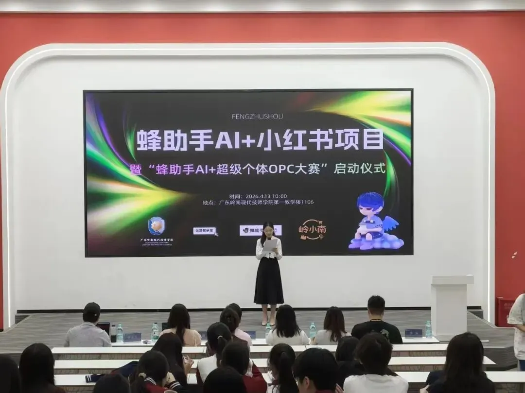 2026 年 4 月 13 日上午 10 点,25-26 学年第二学期蜂助手小红书项目暨 第十届科技节技能竞赛“蜂助手超级个体 OPC 大赛” 启动仪式在电子商务学院爱晚楼1106东阶梯隆重举行。蜂助手企业嘉宾:蜂助手股份有限公司 大会员事业部总经理李泽文、蜂助手股份有限公司企业代表 李志言、蜂助手股份有限公司企业代表谢青卿及电子商务学院领导、教师和全体参赛学生齐聚现场,气氛热烈、秩序井然,共同开启校企协同育人、实战赋能成长的全新篇章。