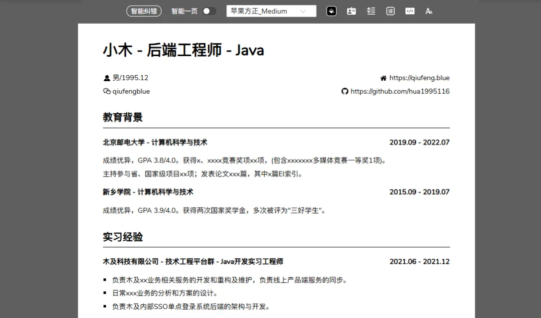 基于Markdown语法的在线简历工具,非常极简。如果你习惯用Markdown写文档,会感觉非常顺手——不用折腾排版,专注内容本身就好。