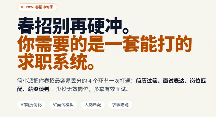 简小派 = 简历优化 + 面试模拟 + 岗位匹配 + 求职陪跑,四个环节全包了。2026春招专版刚更新,不想在多个工具之间来回切换的话,这个平台可以一次性解决大部分问题。