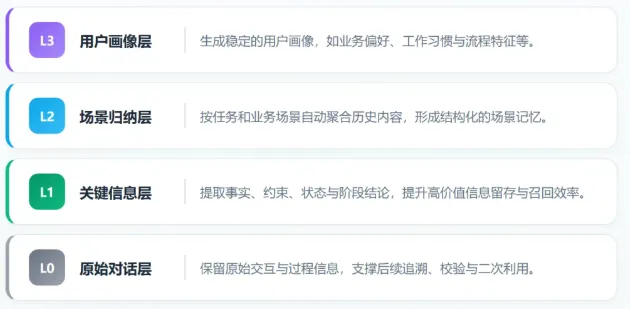 该方案将AI记忆精细划分为四个层次,层层递进,系统化解决记忆问题:
