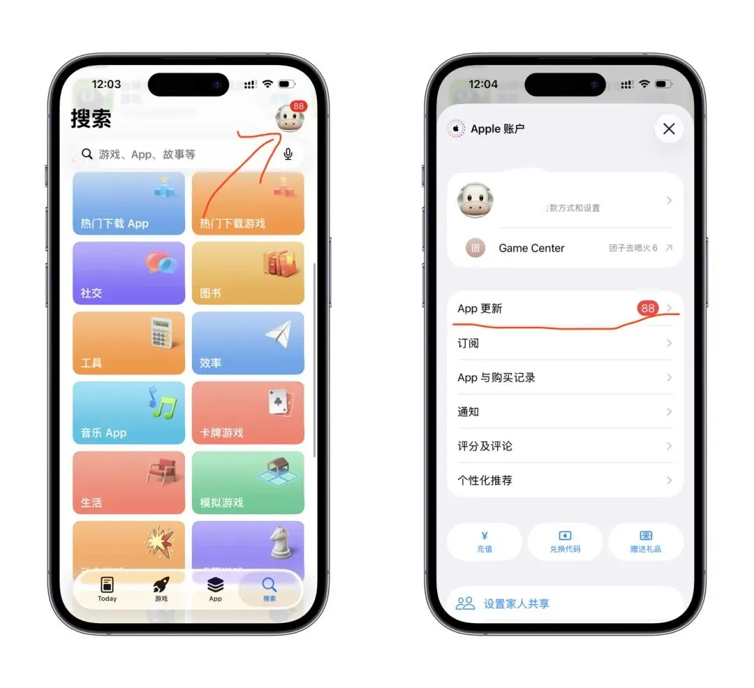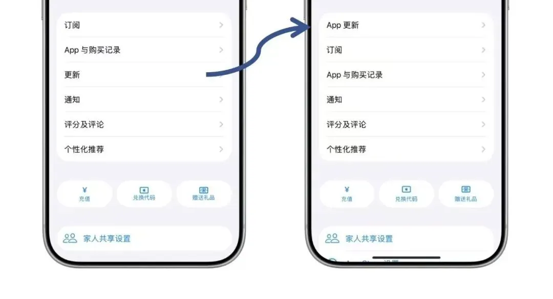 现在打开 App Store,点右上角头像进入 Apple 账户界面,一眼就能看到最顶部的「App 更新」选项,和之前的「App 与购买记录」互换了位置。名字改得直白,位置也摆在最显眼的地方,不用再眯着眼睛在列表里找半天了。