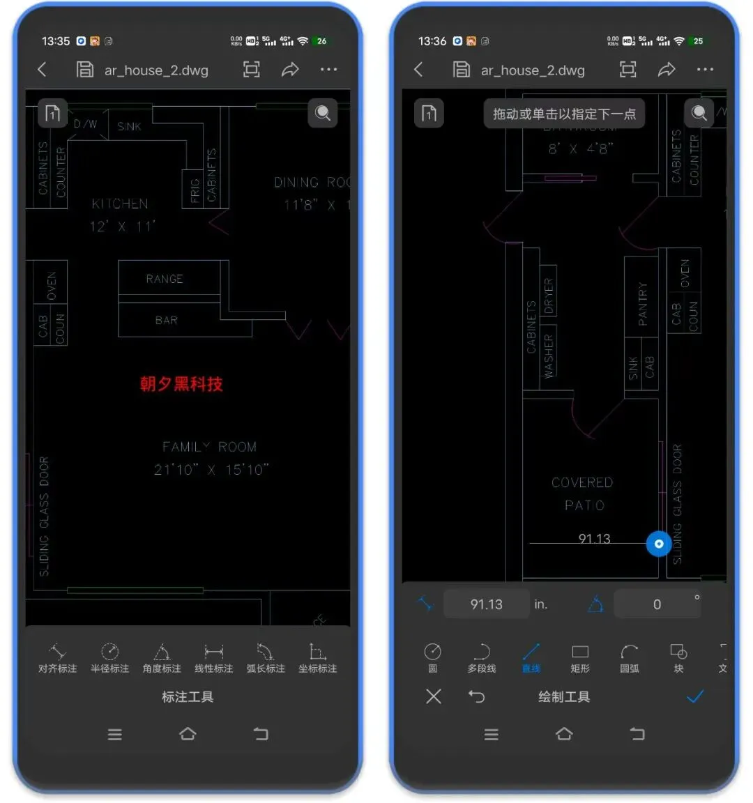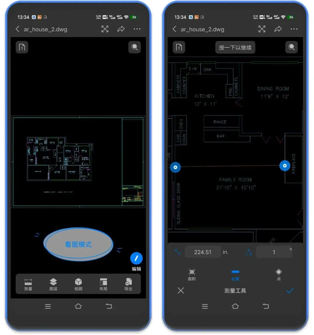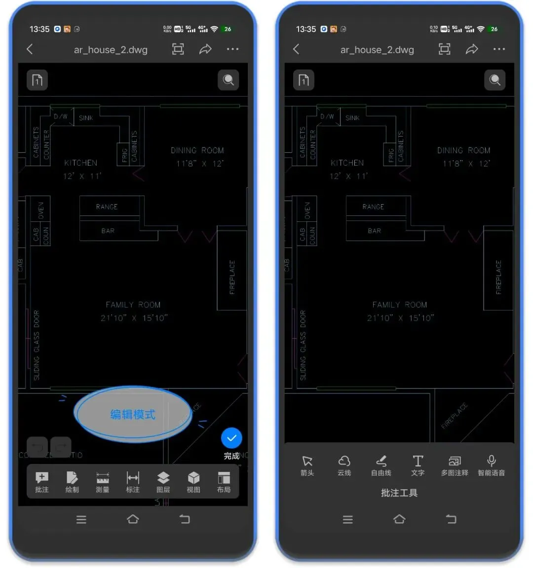 3、编辑模式也很强大,批注,绘制,测量,标注,图层,视图,布局全方位。细化到箭头文字矩形圆弧等,简单编辑没毛病,适合电脑不在身边时候应应急!