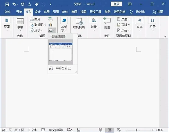 如果想要插入当前Word窗口,可在只打开Word窗口的情况下,点击【插入】-【捕获屏幕截图】按钮,在弹出菜单的“可用视窗”中将以缩略图的形式显示当前Word活动窗口,选择它即可插入到文档中。