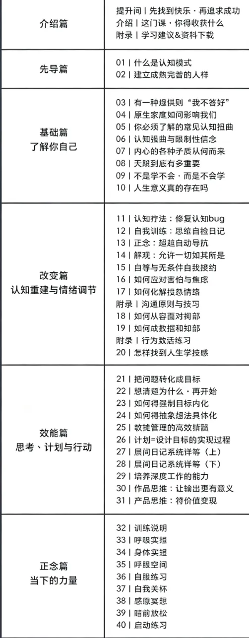 从认知重建与情绪调节,到高效能习惯的养成,再到价值的输出与创造。每个阶段都有相应的训练目标。