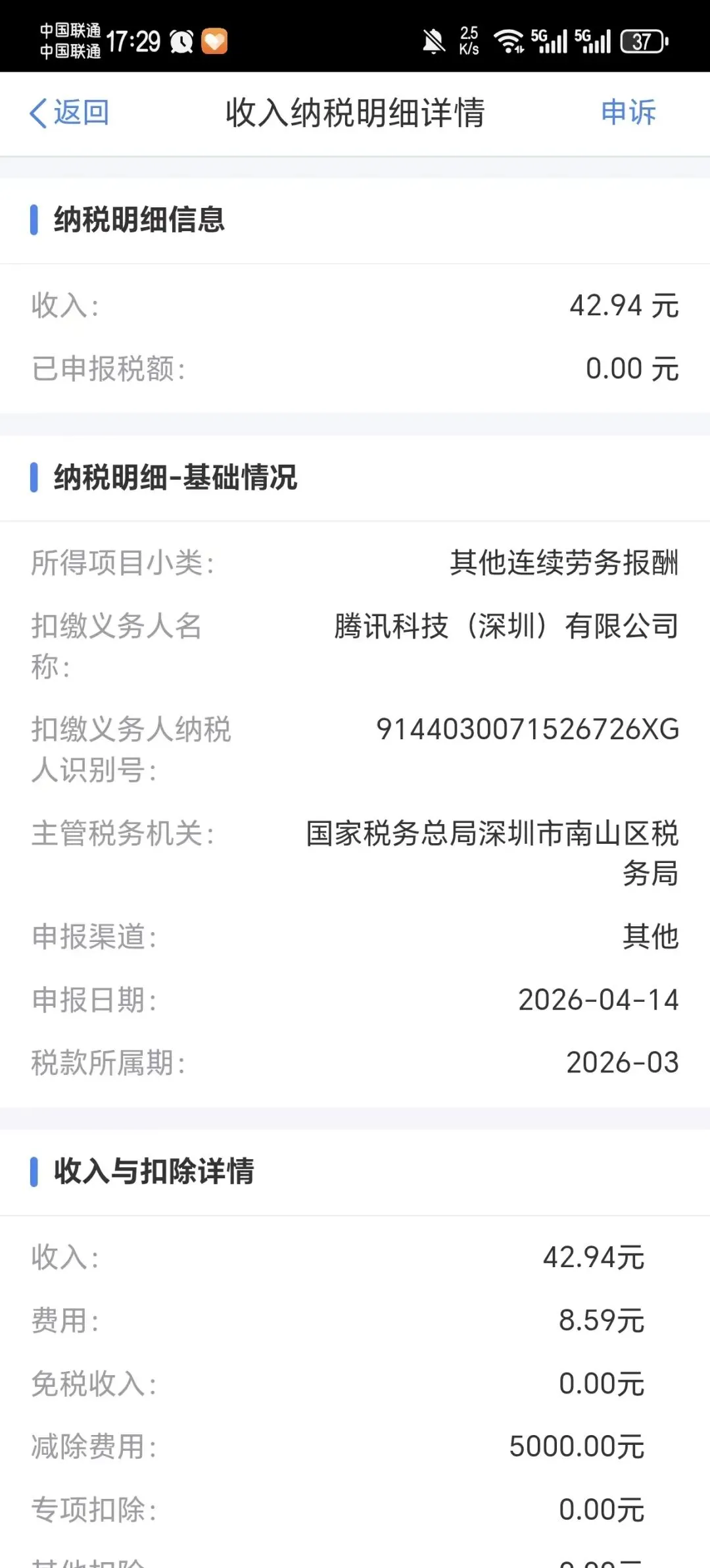 步骤:打开 个人所得税–收入纳税明细–查询–劳务报酬(腾讯科技(深圳)有限公司)