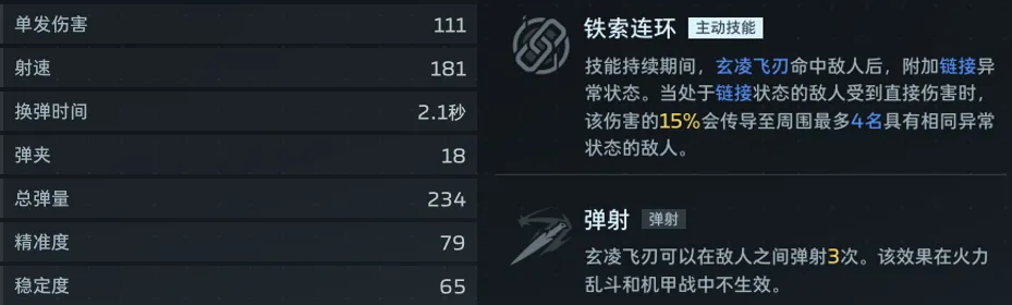 在说明具体插件前,我们先从基础属性上来分析这个武器:玄凌飞刃的单发伤害和射速都较为均衡,主动技能可以在命中敌人后附加链接异常状态,随后单一敌人受到的伤害会传导至周围敌人身上,被动效果则是其可以在敌人之间弹射三次。后者正是最超模的地方——相当于自动锁头了,在常规队友中已经能获得更高的击杀率和伤害。