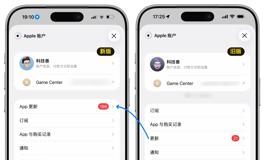 打开 App Store 点击右上角的个人头像进入「Apple 账户」页面,相比之前的版本,现在「App 更新」这个入口被直接放到了顶部,一眼就能看到。这个大家最常用的功能,放在最上面确实比以前更顺手。
