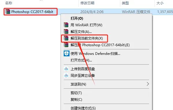 1.打开下载的Ps软件安装包,鼠标右击选择【解压到当前文件夹】。
