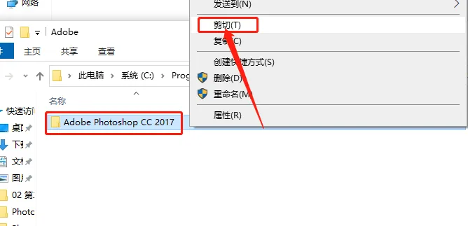 21.鼠标右击【Adobe Photoshop CC 2017】文件夹,选择【剪切】。