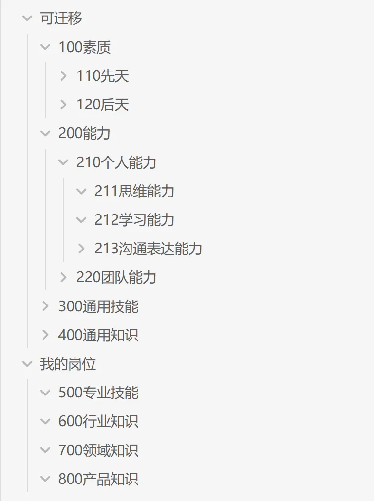 有了能力树后,就可以转为你的知识体系目录。我们以Obsidian为例,就是下面这样: