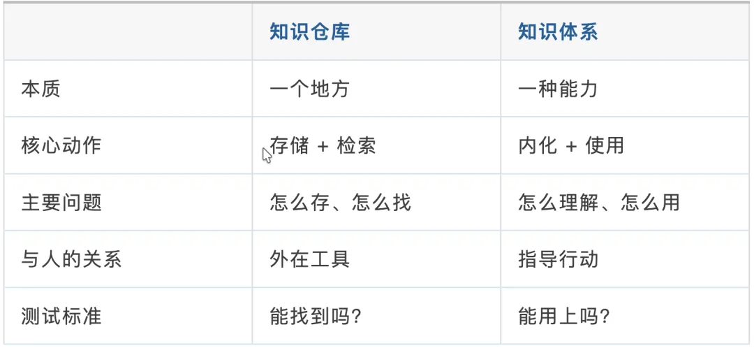 知识仓库,是把信息存在外面;知识体系,是把知识内化进脑子里。