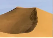 ②鸣沙山,是敦煌的地标。据说,烈烈的西风日夜不息吹动着流沙,飒飒作响,如丝弦鸣奏,故此得名。鸣沙山下,是一望无际的翻滚着浪涛的沙海。风吹细沙涌起的褶皱如凝固的波纹,一道道慢慢铺展着,向远方缓缓地延伸着,间或一个个巨浪高高伫立起来,就是一座又一座的沙山,它们有的像一座巍峨城堡,有的像一匹奔驰的骏马,还有的像一条横卧的巨龙,山脊线如刀背般锋利而又蜿蜒,错落交叠却又脉络分明。