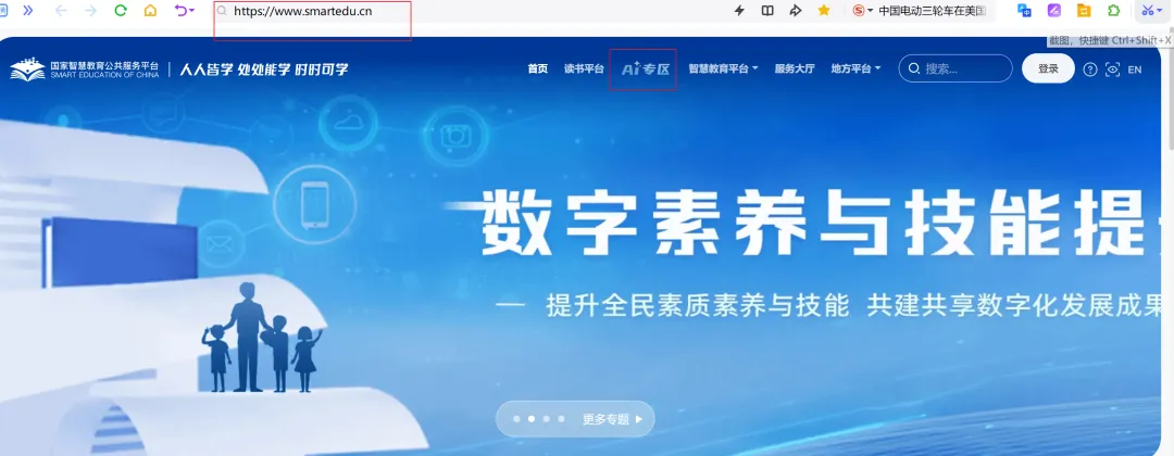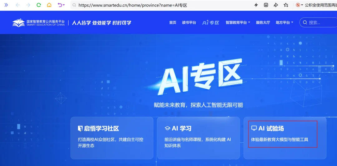 1、打开国家智慧教育服务平台网站,找到上方的【AI专区】,点击进入【AI试验场】。
