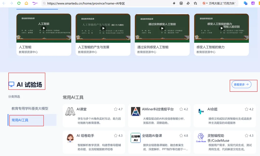 2、在AI专区页面最下方有一个【常用AI工具】,点击右上角的【查看更多”】