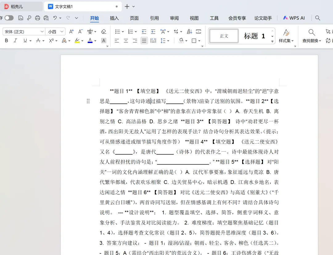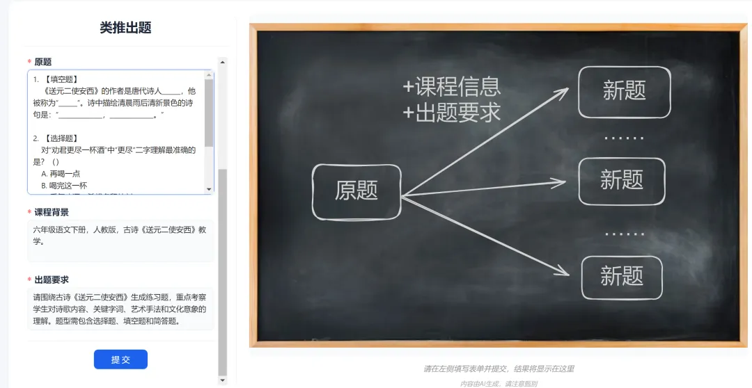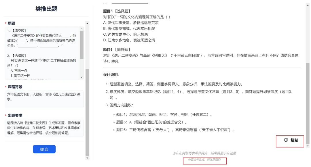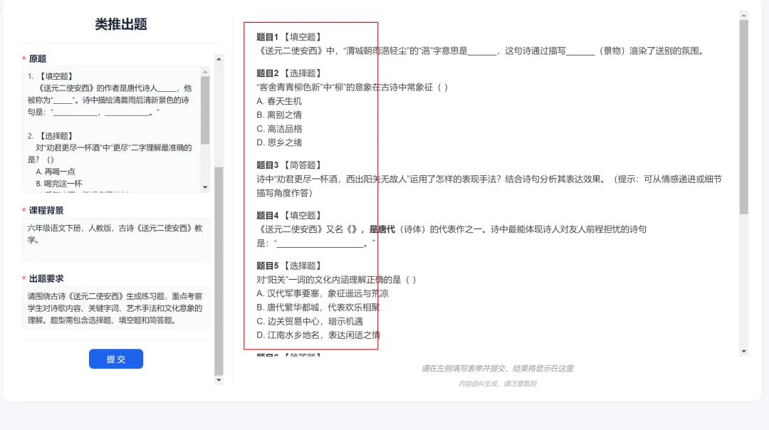 我们分别把《送元二使安西》原题、课程背景和出题要求填写进去,这是我用的提示词,大家参考针对自己学生修改出题要求。