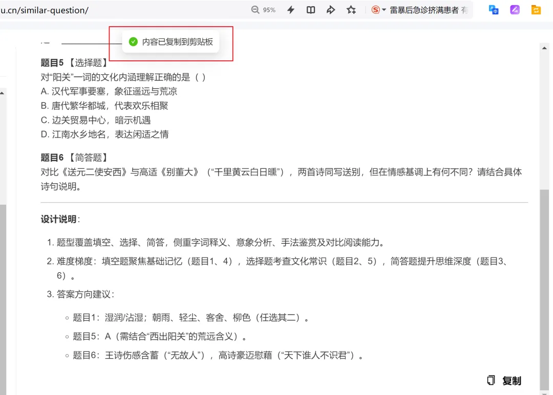 确认题目没有问题,滑动到页面最下方有一个【复制】按钮,点击后,页面有提示框【内容已复制到剪切板】,表示复制成功。