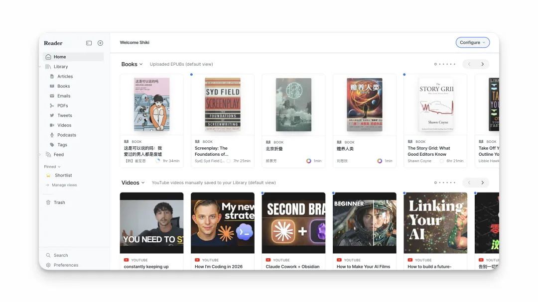 网页、YouTube 视频、X 长推文、邮件、PDF、电子书,都可以统一放进 Readwise Reader。