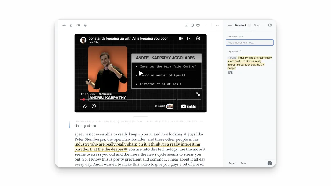 如果你经常看 YouTube,它还有一个很实用的地方:视频转存进来之后,可以抓取字幕。可以像处理文章一样高亮字幕、批注内容,后续 AI 也能搜索到这些被你标记过的内容。