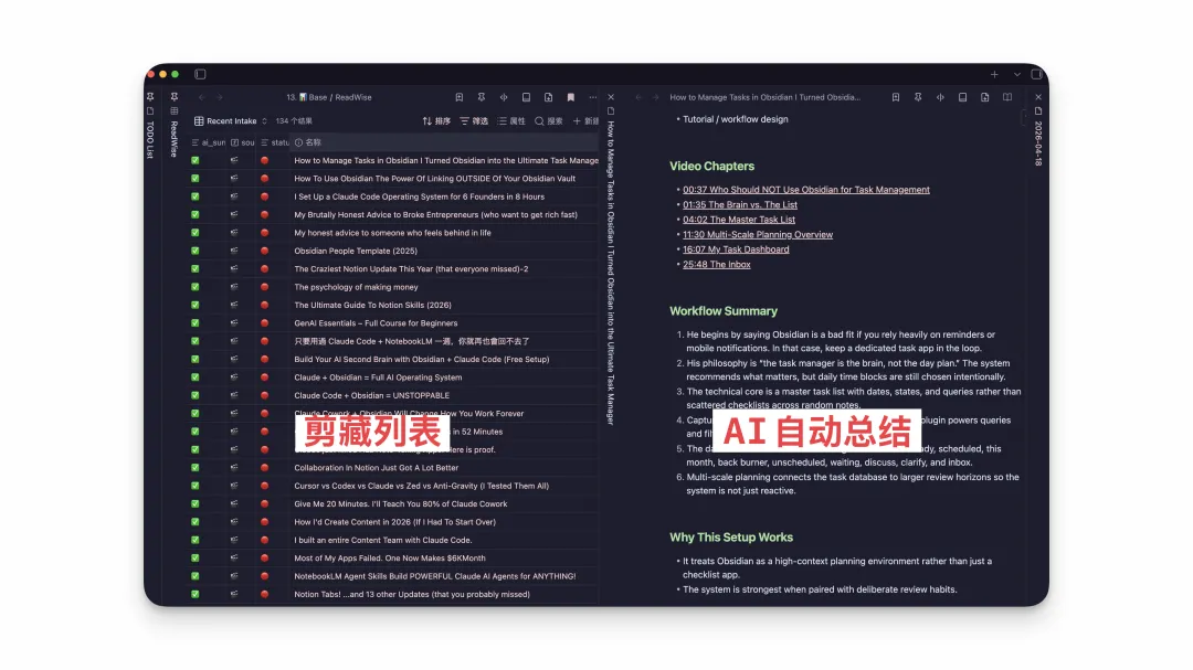 Readwise Reader 负责把信息收进来,Obsidian 负责把信息沉淀下来、连接起来,再交给 AI 继续整理、复习和产出。这样才更像一套完整的知识管理工作流,而不是又多装了一个收藏软件。