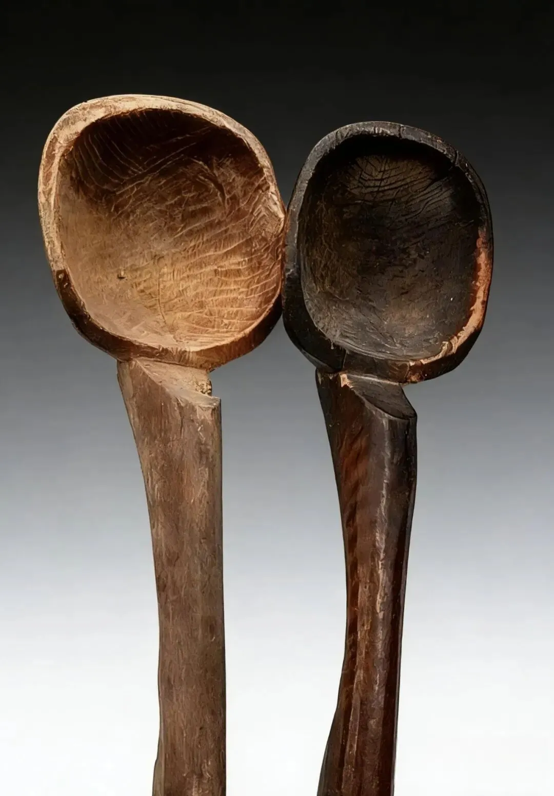 这两把木勺并排站着,像两个沉默的老伙计,一把颜色浅些像是刚出土,一把黑得发亮像是浸透了墨汁,其实那不是墨,是几十年煮饭搅粥盛汤,油呀淀粉呀水呀反复渗进木头纹理里,又被无数双手磨出来的一层膜,不锈钢勺子冷冰冰的敲在碗边当当响,哪有这木勺温润,勺子边沿那些凹痕,是一代人手握的力道,三代人留下的痕迹,摸上去滑得像抹了油,却有着木头原本的粗粝感。