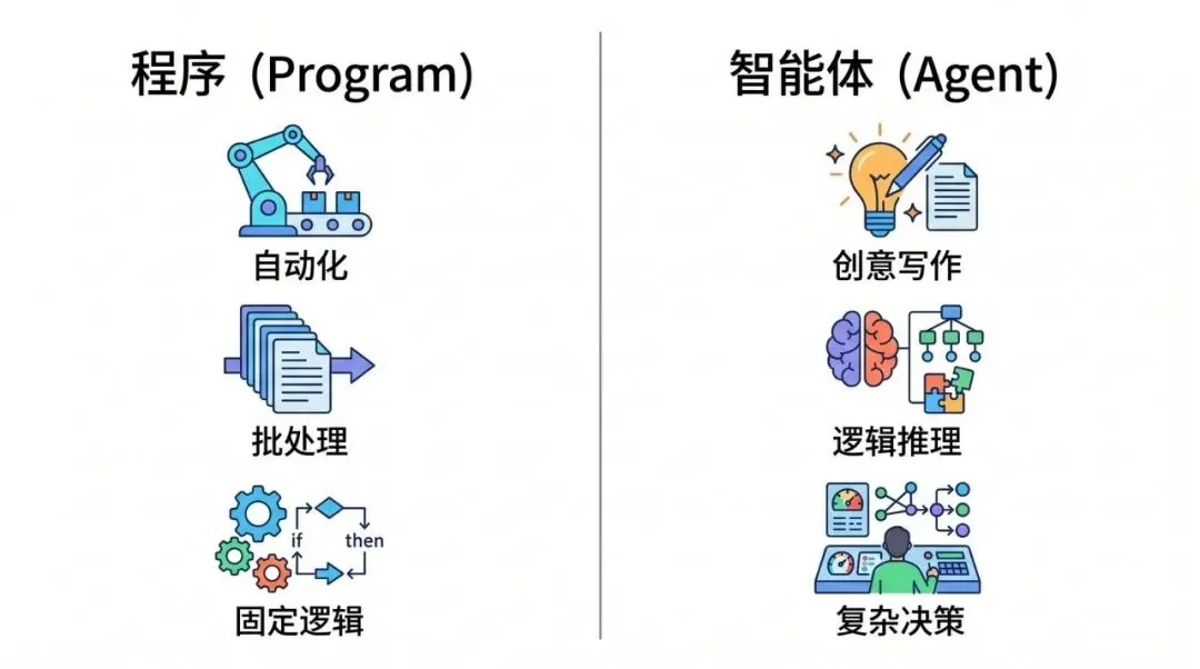 理解入口的差异,能帮助你选择合适的运行载体: * 入口定义: * 程序:常见入口包括双击启动的 .exe 文件、终端运行的 python 命令等。 * 智能体:入口是提示词对话。例如在豆包问”帮我查询热点新闻”,或在 ClaudeCode 里让它”批量修改文件名”。 * 运行载体: * 程序的载体非常多,如系统终端或特定执行环境。 * 智能体的载体相对较少。目前的 AI 编程工具(如 ClaudeCode, OpenCode)是一类;OpenClaw 等开源项目是一类;豆包只能算”半个”载体,因为它只能运行扣子(Coze)平台开发的智能体。
