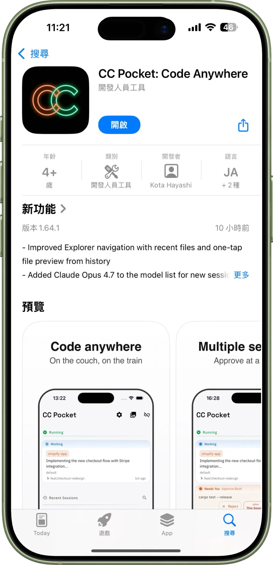 CC Pocket:通过 Bridge Server 连接,支持实时的流式输出(AI 在想什么、做什么、输出什么,你都能看到)。支持 SSH 远程管理电脑,可以从手机启动/停止/更新 Bridge Server。